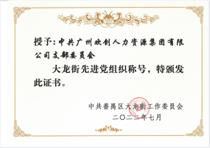 荣获番禺区大龙街党工委颁发“先进基层党组织”称号
