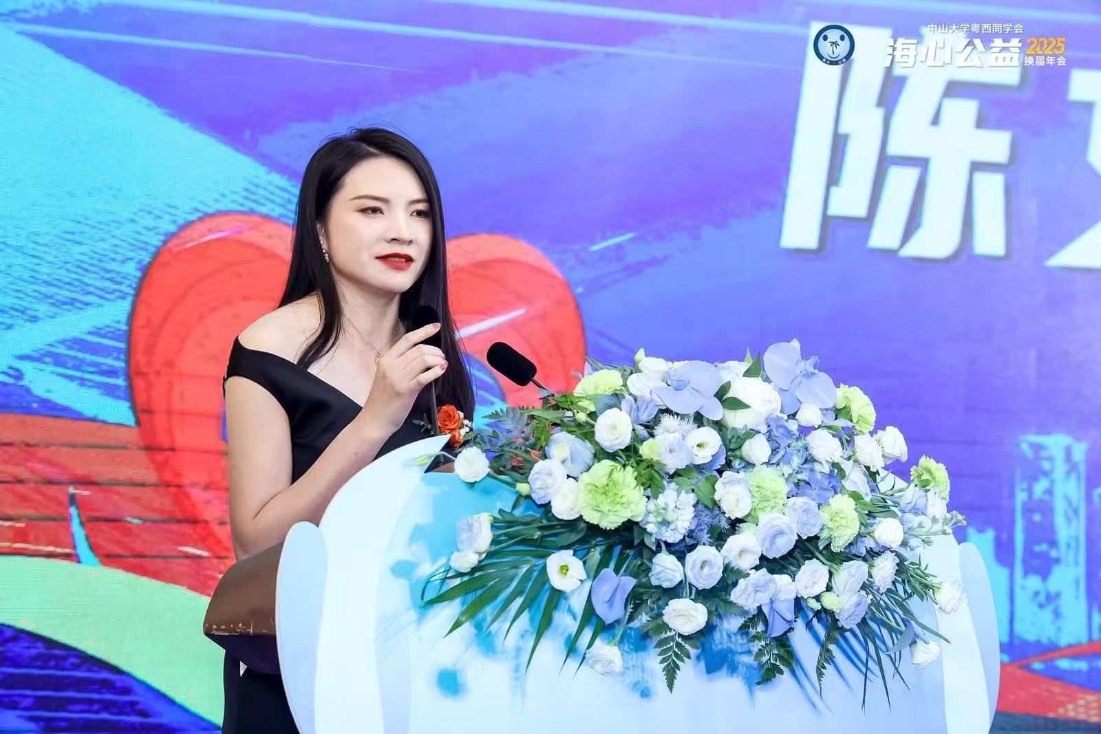 晚会现场,海心公益创会会长冯学昌先生将象征责任与传承的会旗郑重交予陈文舒女士。作为欢创集团的党支部书记、总裁,陈文舒女士始终秉持“企业发展与社会责任并重”的理念,带领企业稳健前行的同时,躬身践行公益使命,她用实际行动诠释了海心公益“以爱为舵,以信为帆,恪守责任,服务社会”的使命。她在履新致辞中表示,将不负众望,履行会长职责,凝聚更多力量,激发更大能量,携手各位校友和爱心人士,共同推动海心公益事业的发展。
